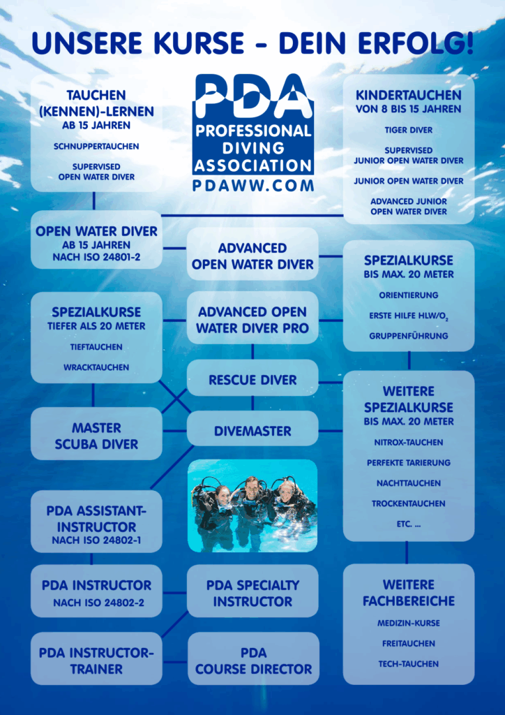 Wir bilden nach den Richtlinien der Tauchorganisation Professionell Diving Association kurz PDA aus.